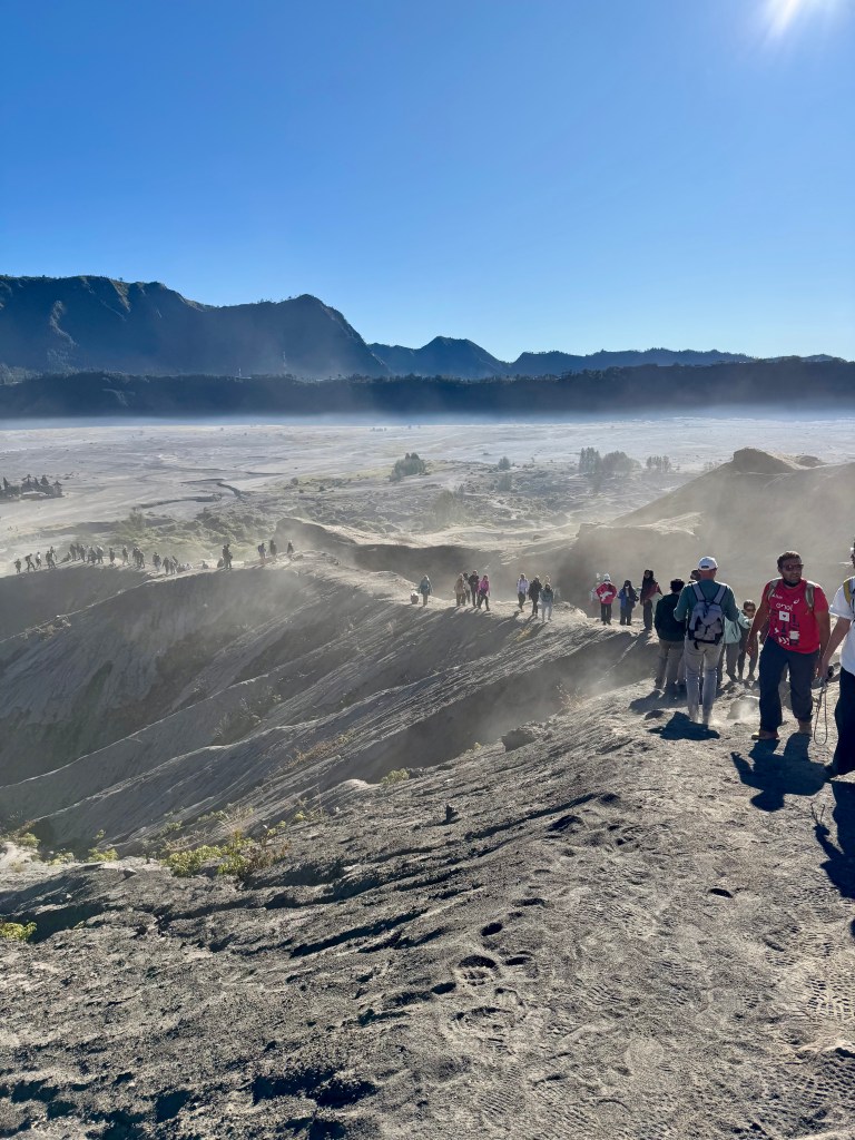 The landscape is otherworldly — an expanse of ash and sand known as the “Sea of Sand,” with Mount Bromo rising in the distance. After crossing the sandy plain, a climb of about 250 steps takes you to the crater’s edge. Surprisingly, there are almost no fences, so you need to be very careful near the rim. The air smelled strongly of sulfur, but the view into the smoldering crater and across the vast volcanic terrain was absolutely worth it.