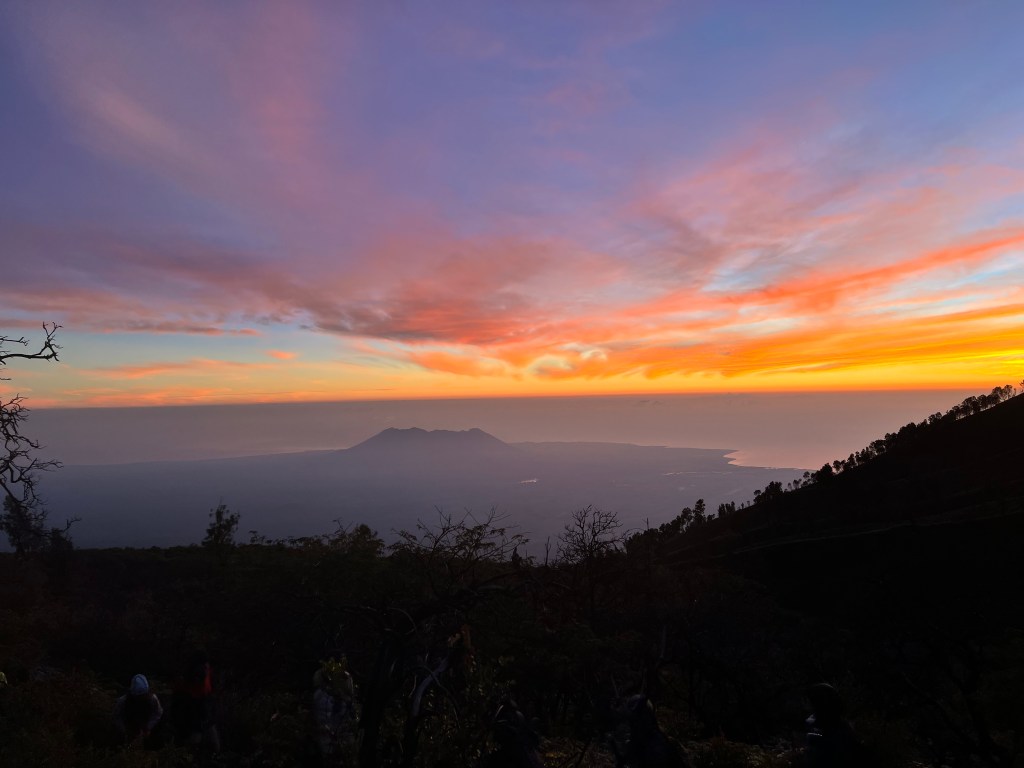 As the sun began to rise, the lake and its surroundings slowly revealed themselves in a burst of color, creating a magical view. Along the way, we passed hardworking sulfur miners carrying heavy loads up and down the mountain — a dangerous and grueling job still done using traditional methods. Locals offered rides on small carts they called “Ferraris” or “Lambos.”