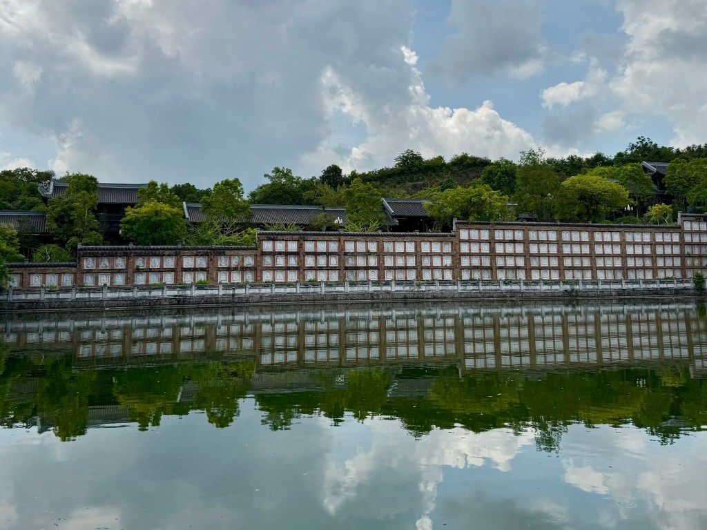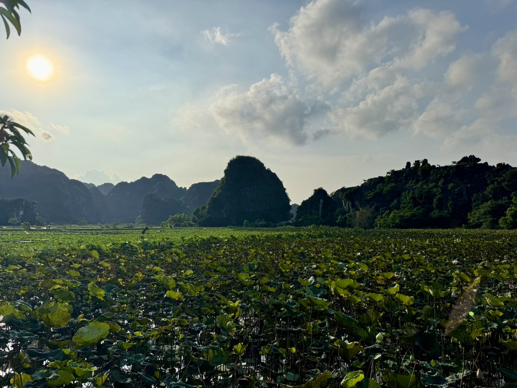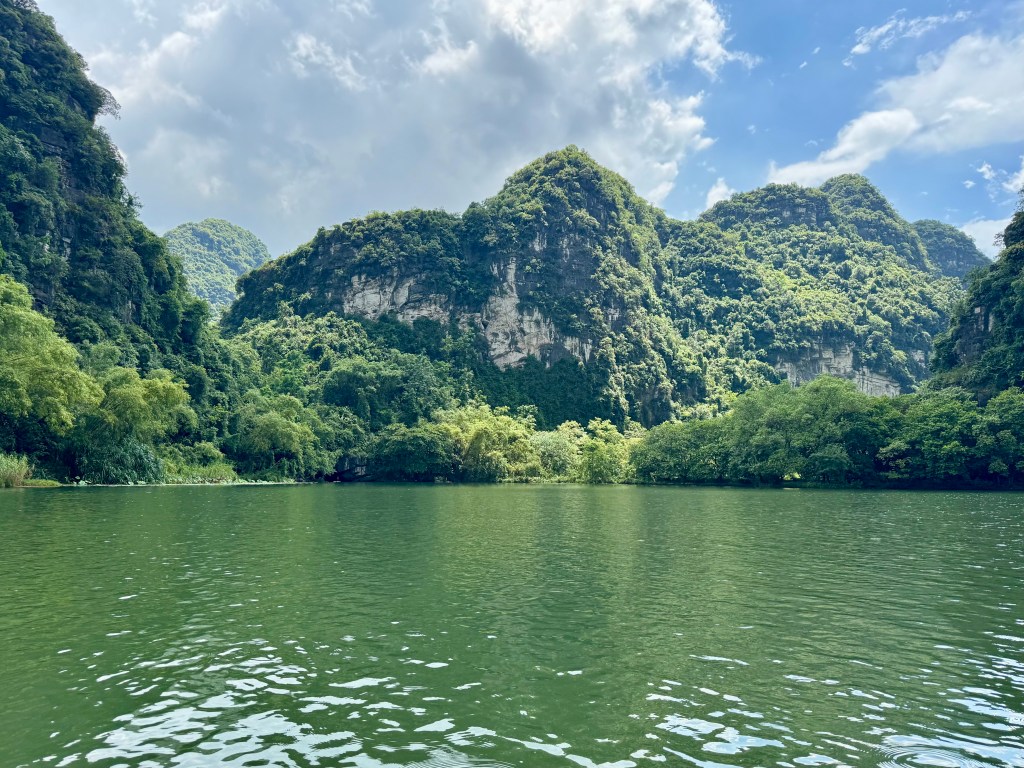 The next day, we joined a full-day tour through Ninh Binh. Our first stop was Bai Dinh Temple, an impressive complex filled with countless Buddha statues. Our guide was a character: He could say a few words in nearly every language represented in our group and shared stories about Vietnamese history along the way. It was also the hottest day of our trip: 44 degrees. While we were melting, our guide (like many locals) was fully covered in sun-protective clothing to avoid tanning. This contrast really highlighted cultural differences in beauty standards and daily habits.